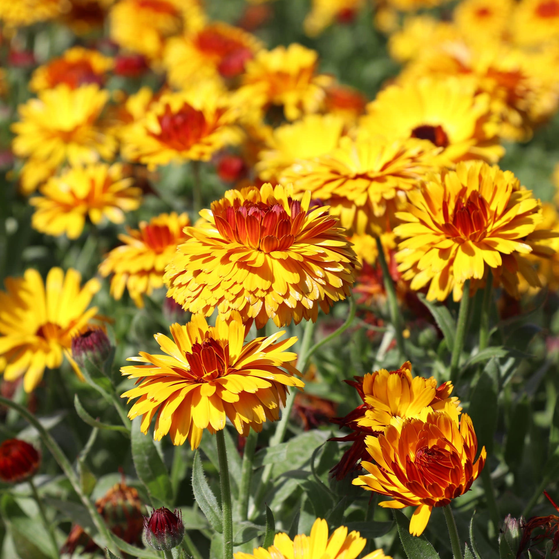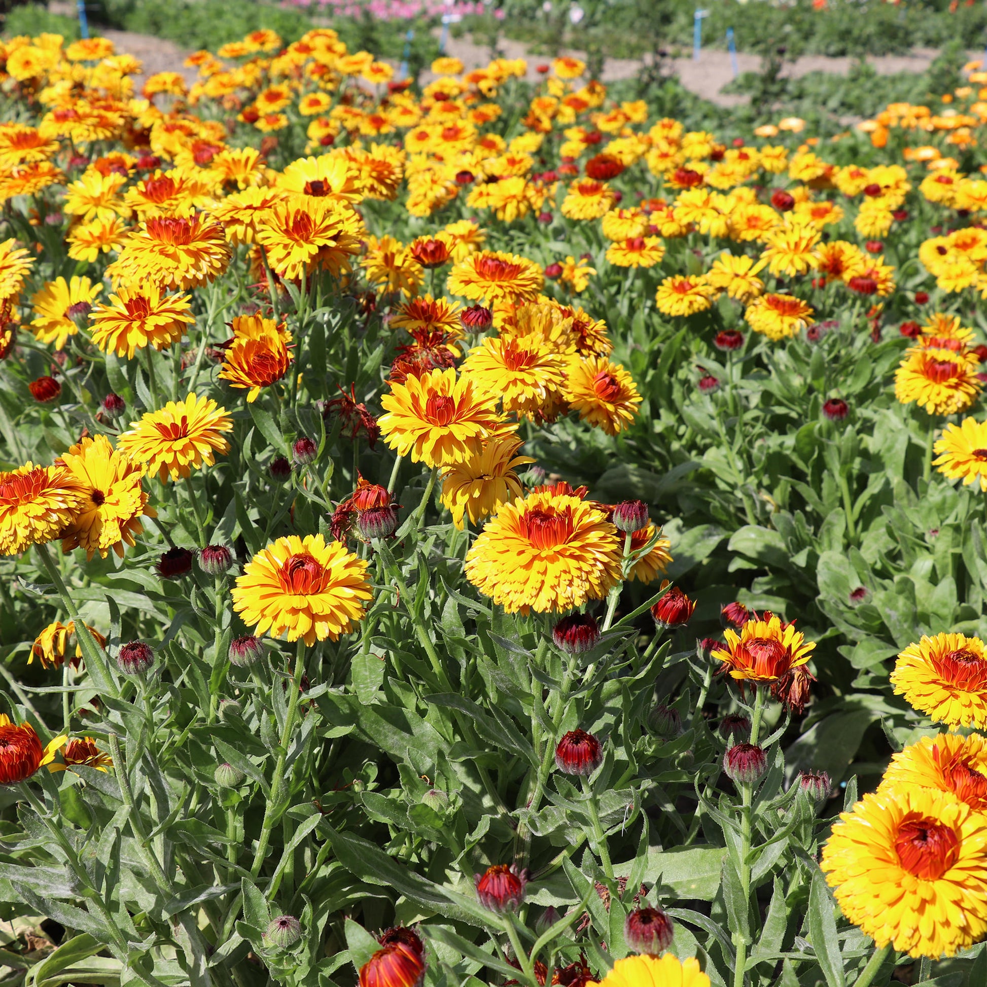 New flower type in Pot Marigold: gold pompon flower with red eye. A unique flower shape.